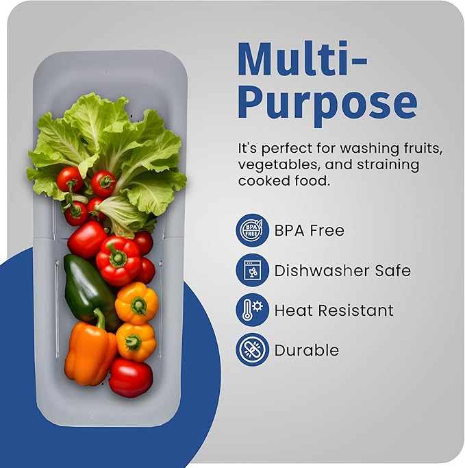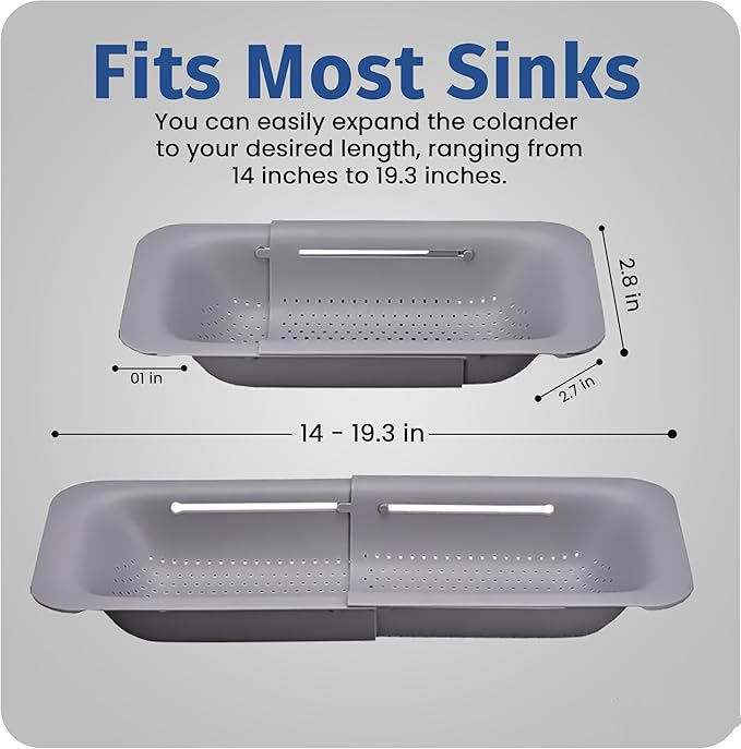 The over-the-sink colander, is simple and easy to use, simply expand the colander to the desired length, and place it over the sink, the colander can extend from 14”-19.3”